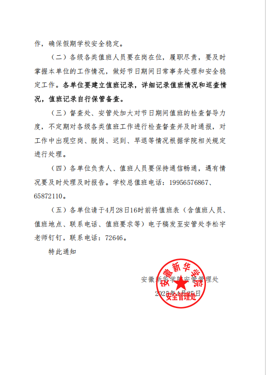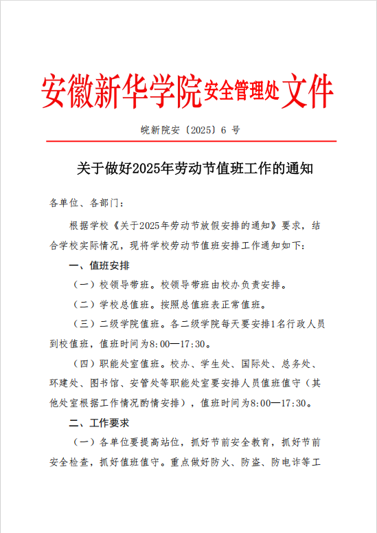 关于做好2025年劳动节值班工作的通知