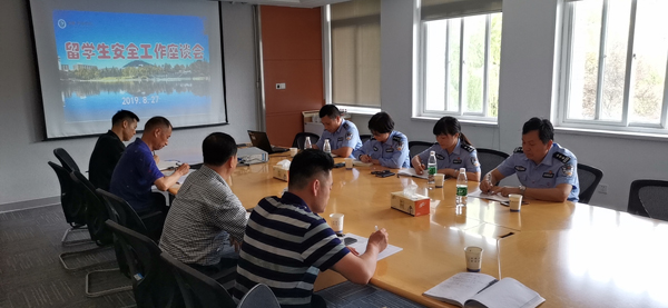 本网讯 (通讯员:仇陶)按照学校相关工作安排,结合beat365官网留学生和外教管理的现状,8月27日上午,留学生安全工作座谈会在国教院二楼会议室召开,公安高新分局治安大队、国保大队、高新派出所的分管领导和干警,国教院院长徐鸣、留学生管理人员和保卫处有关人员参加会议。会议由保卫处副处长仇陶主持。