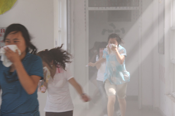 下午三点整,火灾警报紧急拉响,学生公寓楼内烟雾弥漫,公寓楼内所有学生严格按照演练要求,每人手拿一条湿毛巾,紧捂着口鼻,一个紧挨着一个按照疏散指示路线,迅速通过烟雾区及安全出口,2分钟内安全有序地撤离到了安全地带。
