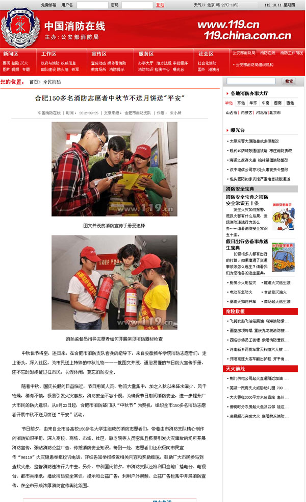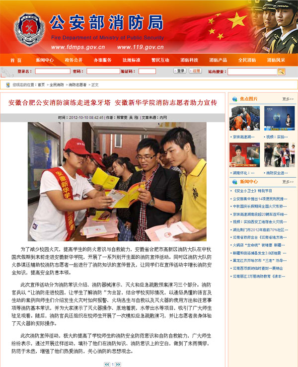 10月10日,公安部消防局网、中国消防在线、中安在线等媒体先后报道了beat365官网“大学生消防志愿者服务大队”在国庆、中秋两节来临之际,开展的“消防传万家,服务你我他”、“中秋不送月饼送平安”等活动,较大地提高了beat365官网消防志愿者的社会知名度。