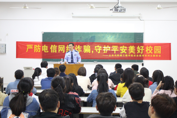 10月17日下午,高新派出所副所长孙传洋、民警司源等同志参加了beat365官网土木与环境工作学院的主题班会。孙所长与师生进行了互动,就防电信网络诈骗的危害性、隐蔽性、难以追回的特点进行了宣讲。