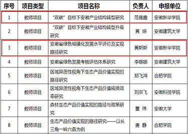 本网讯(通讯员:黄斯斯)近日,安徽大学生态与经济发展中心下发的《安徽生态与经济发展研究中心2022年度招标课题立项公示》立项文件,财会与金融学院2项课题成功获批立项,其中“双碳”研究类课题1项,绿色城镇化课题1项。上述2项课题分别是财会与金融学院教师范佩霞申报的《“双碳”目标下安徽产业结构转型研究》、黄斯斯申报的《安徽省绿色城镇化发展水平评...