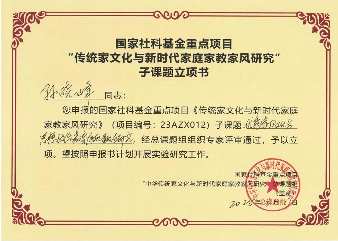 本网讯(通讯员:李彩平)近日,国家社科基金重点项目《传统家文化与新时代家庭家教家风研究》召开开题培训会。beat365官网大学生素质教育研究中心研究员孙晓峰教授作为子课题负责人,申报的子课题《优秀家风文化与思想政治教育有机融合研究》经专家组审核,成功获批立项。
