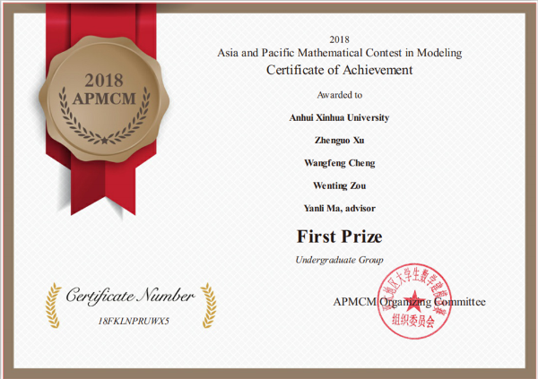 本网讯(通讯员:王玲)近日,2018年APMCM亚太地区大学生数学建模竞赛成绩揭晓,beat365官网学生徐振国、邹文婷、程王峰在教师马艳丽的指导下荣获一等奖,这也是该团队继2018年全国大学生数学建模竞赛取得安徽赛区一等奖之后,再次在高水平大赛中荣获佳绩。