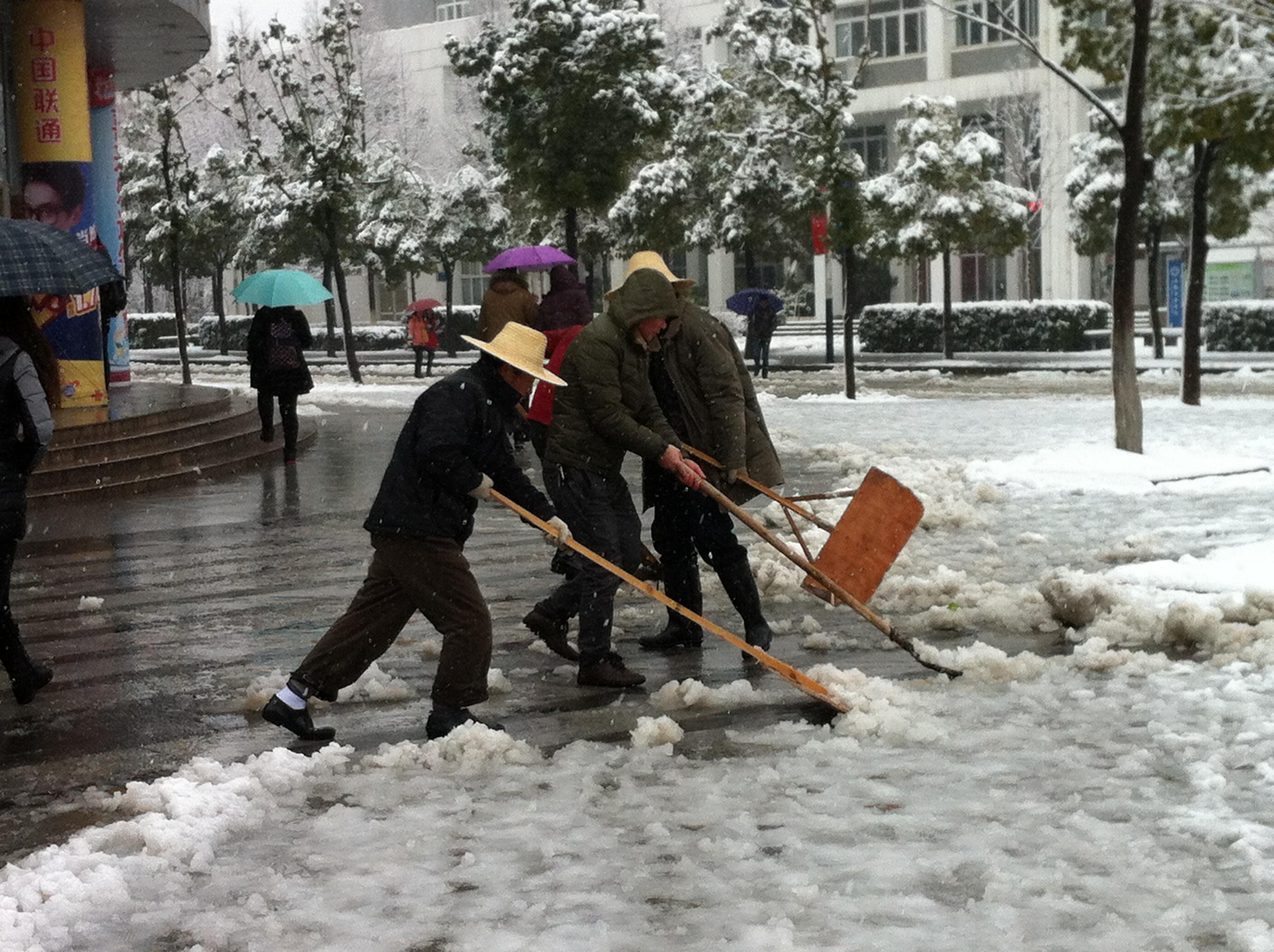 尽管寒风袭人,积雪湿透了鞋袜,但是大家仍冒着风雪,铲雪除冰。经过一个上午的集中除雪,中快广场...