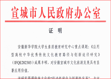 本网讯(通讯员:李平)近日,大学生素质教育研究中心课题《应用型高校中华优秀传统文化教育路径与创新途径研究》(主持人:李倩)取得丰硕研究成果,其核心对策与建议已正式被宣城市人民政府采纳,标志着大学生素质教育研究中心科学研究在服务地方文化发展与教育创新方面取得了突破性进展。