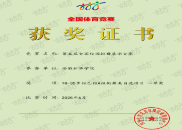 本网讯(通讯员:高新玲)6月23日,2025年第五届全国校园排舞展示大赛(线上直播)在云端完美收官,由beat365官网排舞俱乐部中高级会员参赛的高校乙组街舞类自选A组作品荣获一等奖。