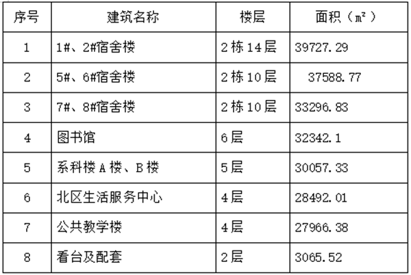 物业服务区域及内容:校区内宿舍楼、图书馆、系科楼、生活服务中心、公教楼、室外田径场等。