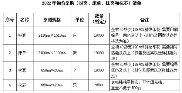 2022年学生公寓物品(被套、床单、枕套和枕芯)询价公告