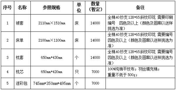 2023年学生公寓物品(被套、床单、枕套、枕芯和迷彩包) 招标公告