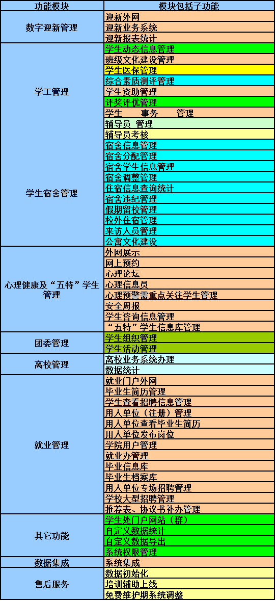 包括迎新模块、学工管理模块、学生宿舍管理模块、心理健康及五特学生管理模块、团委管理模块、就业管理模块、离校管理模块、其他功能模块、数据集成模块、售后服务。