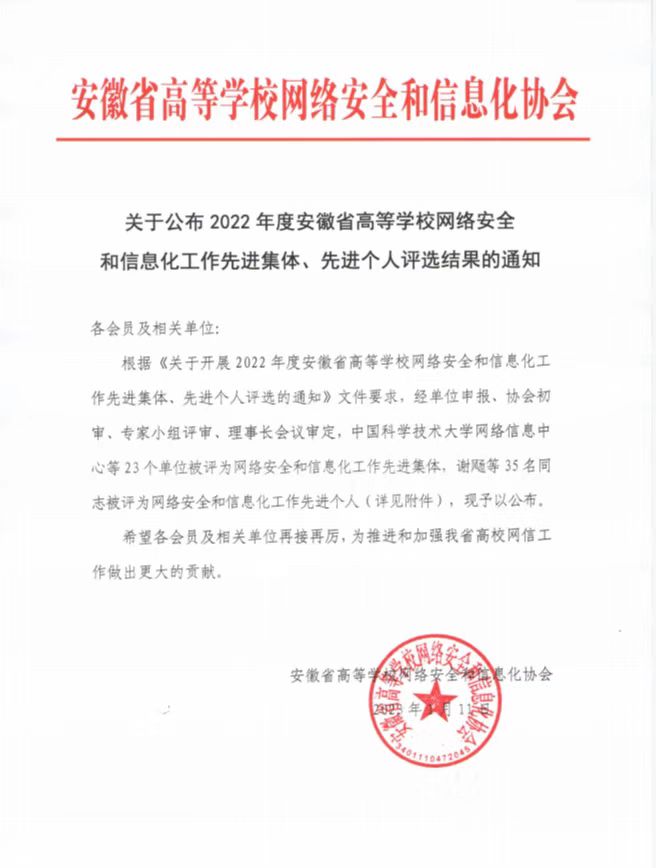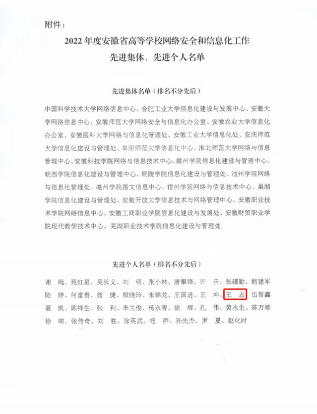 本网讯(通讯员:曲红)近日,安徽省高等学校网络安全和信息化协会发布《关于公布2022年度安徽省高等学校网络安全和信息化工作先进集体、先进个人评选结果的通知》,经过单位推荐、协会初审、专家评审和理事长审定,beat365官网信息化建设与发展中心王志荣获2022年度网络安全和信息化工作先进个人称号。