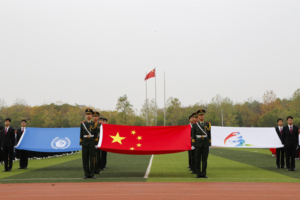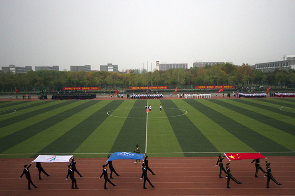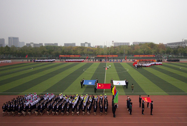 伴随着激情澎湃的运动员进行曲,气宇轩昂的护旗队最先入场,护旗手们高举国旗、校旗和会旗,踏着整齐划一、刚劲有力的步伐走过主席台。由各二级学院代表组成的方阵依次入场。