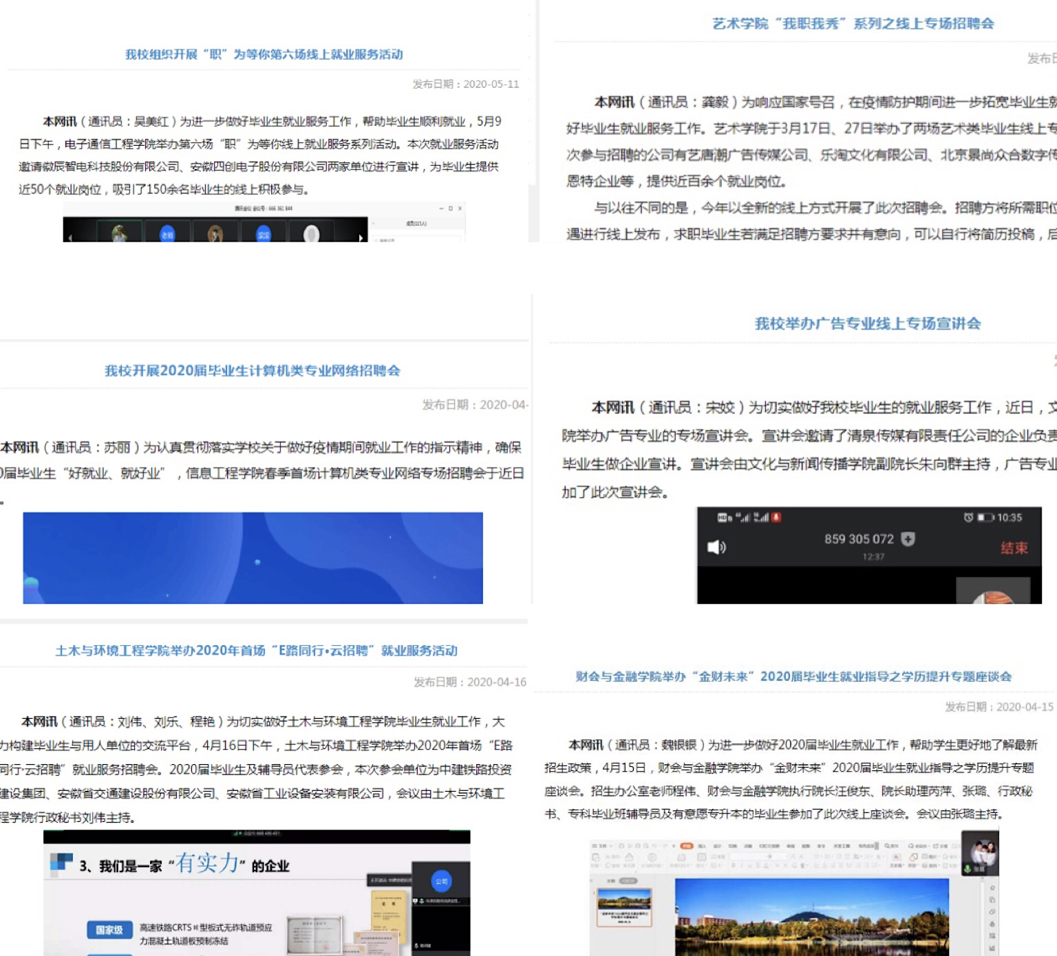 为方便毕业生线上“一站式”的办理签约,beat365官网依托“安徽省大学生就业服务平台”,实现在线投递简历、用人单位与毕业生在线交流答疑、面试洽谈、线上签约等功能。同时,结合毕业生网上求职择业的新变化,beat365官网一方面邀请知名企业HR开展“线上就业指导”,引导毕业生做好疫情下职业生涯规划、网上求职准备和网上面试技巧、求职安全等知识的学习,为顺利求职择业打下良好基础;另一方面及时在线上进行各种就业指导推文,安排辅导员对毕业生网络签约中遇到的问题进行“一对一”精准帮扶指导。