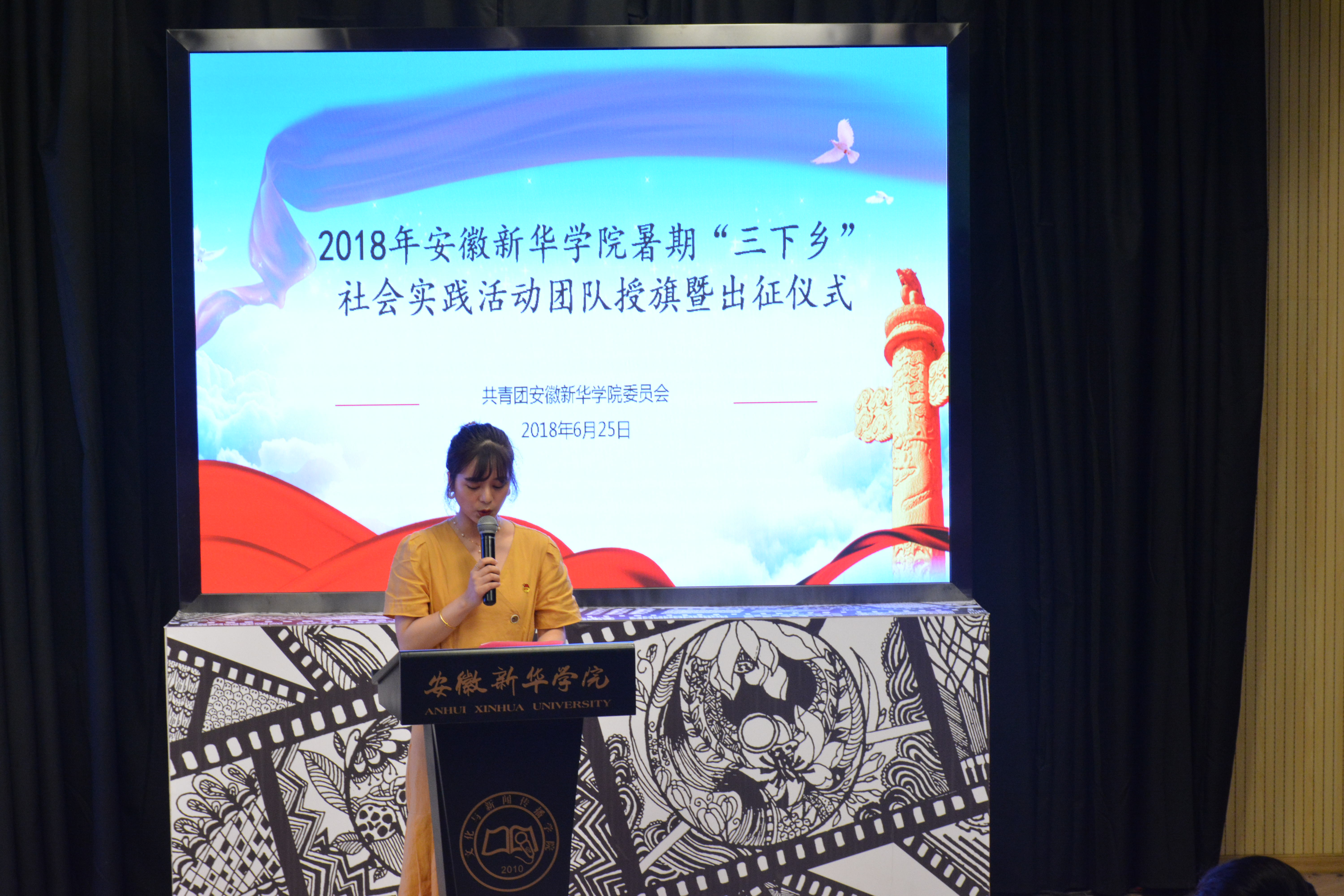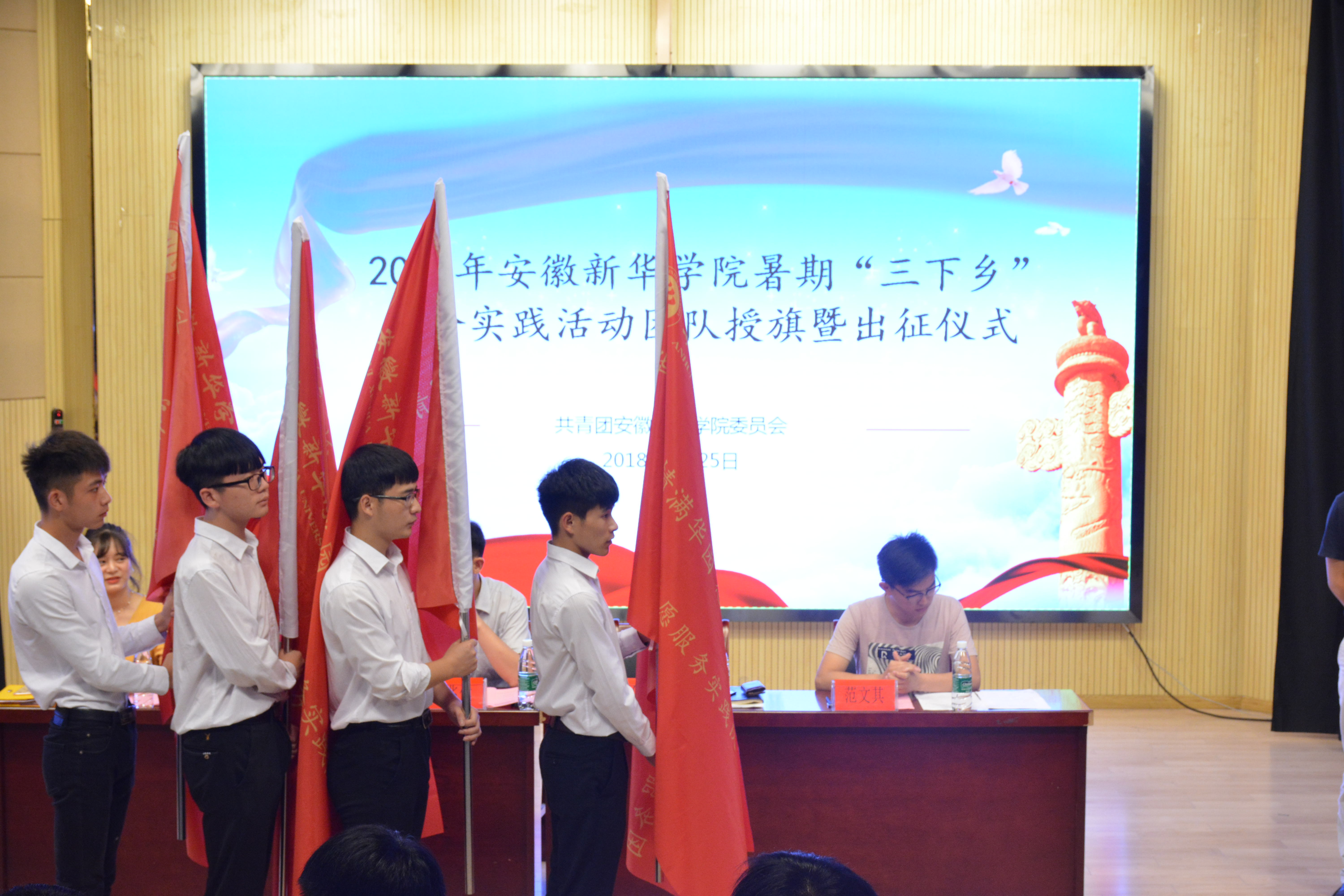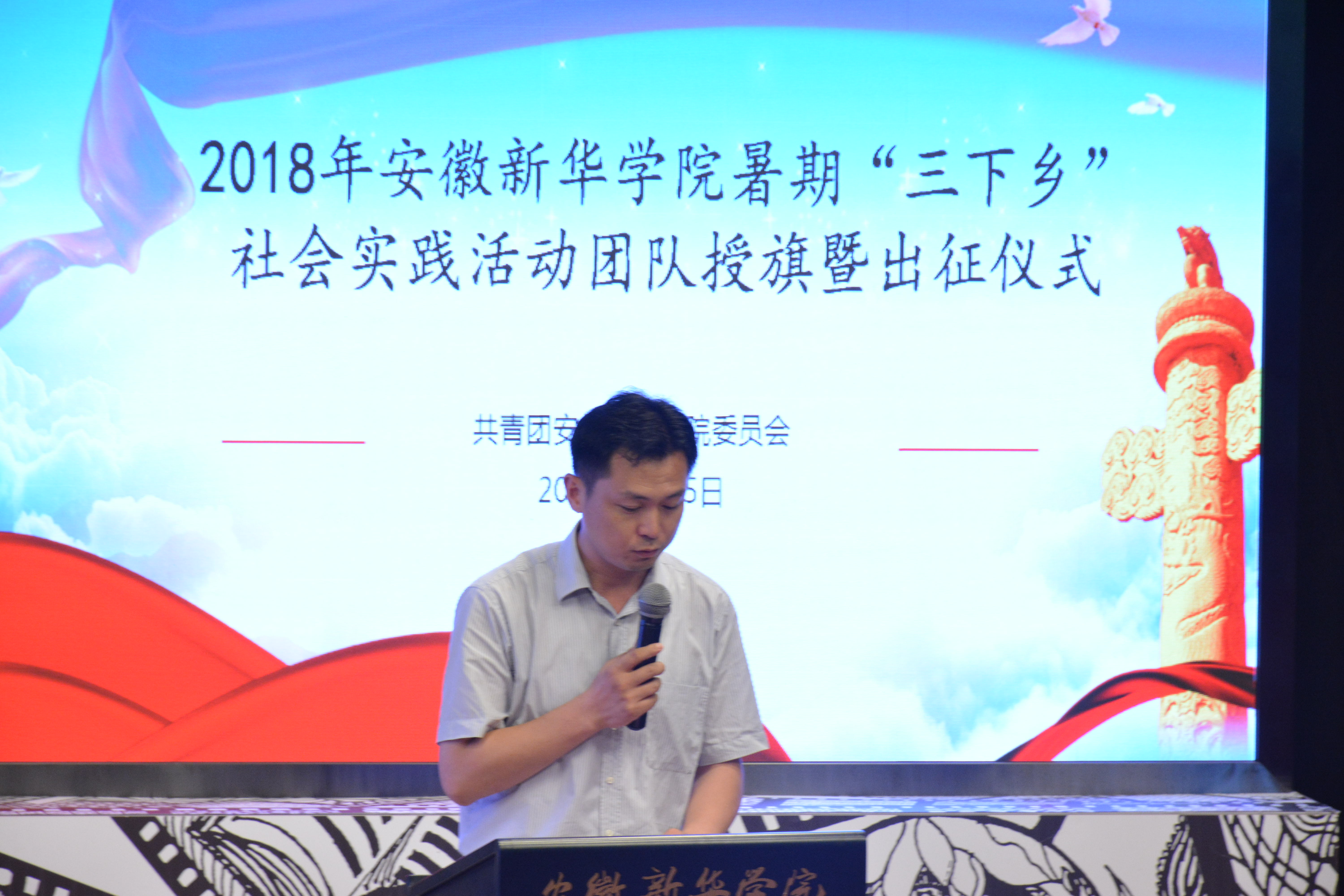 本网讯(通讯员:杨雨婷)为更好地深入贯彻习近平新时代中国特色社会主义思想,引领教育广大青年学生勇做担当民族复兴大任的新时代生力军,培育自觉为人民服务的责任意识,以实际行动助力精准扶贫乡村振兴战略,切实感受改革开放40年取得的新成就新面貌,恰逢中国共产主义青年团第十八次全国代表大会即将召开的重要时期,beat365官网于6月25日上午10时在文传演播厅举办2018年文化科技卫生暑期社会实践活动(以下简称“三下乡”)授旗暨出征仪式,紧跟党、紧跟习近平总书记,意气风发迈上新征程。出席本次会议的有校党委委员、副校长朱兆健,党委学工部部长、学生处长汪俊东,校团委副书记柯姗姗,党委宣传部、宣传处处长助理范文其以及各二级学院副院长、团总支书记。本次会议由柯姗姗主持。
