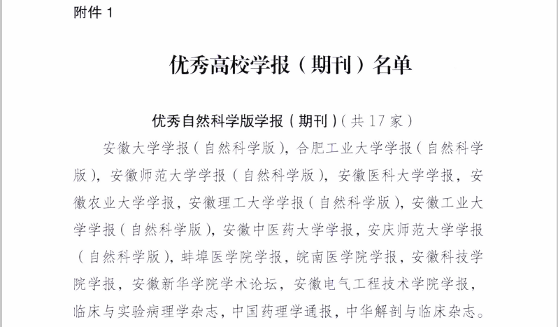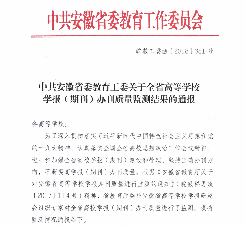 安徽省教育厅委托安徽省高等学校学报研究会组织专家对全省高校学报(期刊)办刊质量进行监测。此次监测的学报、学术期刊及内部准印证刊物共90种,均为中文期刊。实际参加的各类学报(期刊)75种,其中社会科学学报(期刊)48种,自然科学学报(期刊)27种,另有15种学报(期刊)未参加此次监测。为了做好此次质量监测工作,安徽省高等学校学报研究会组织专家制定了期刊质量监测方案,在巢湖学院召开监测评估会,分社会科学学报(期刊)和自然科学学报(期刊)两个专家组,对近四年安徽省高校学报(期刊)(包括安徽省高校主办的内部准印证刊物)进行认真审读。监测得出结果,共17家荣获优秀自然科学版学报(期刊)和28家荣获优秀社会科学版学报(期刊)。