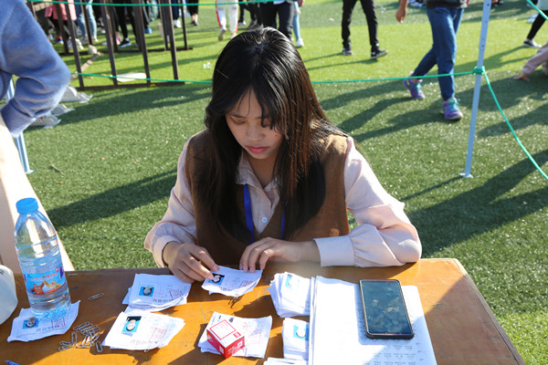 当然,在运动会的赛场上还有一些助理裁判员,他们同样是志愿者,为了运动会的顺利开展默默付出着。“这是我第一次为同学服务,我作为一名志愿者很光荣”,来自财会与金融学院2018级财务与管理4班的刘敏说道,“我开学加入了青年志愿者联合会,这次运动会却是我第一次体验到志愿者的责任感,虽然很累,但是我快乐。”刘敏眼中满是坚定。