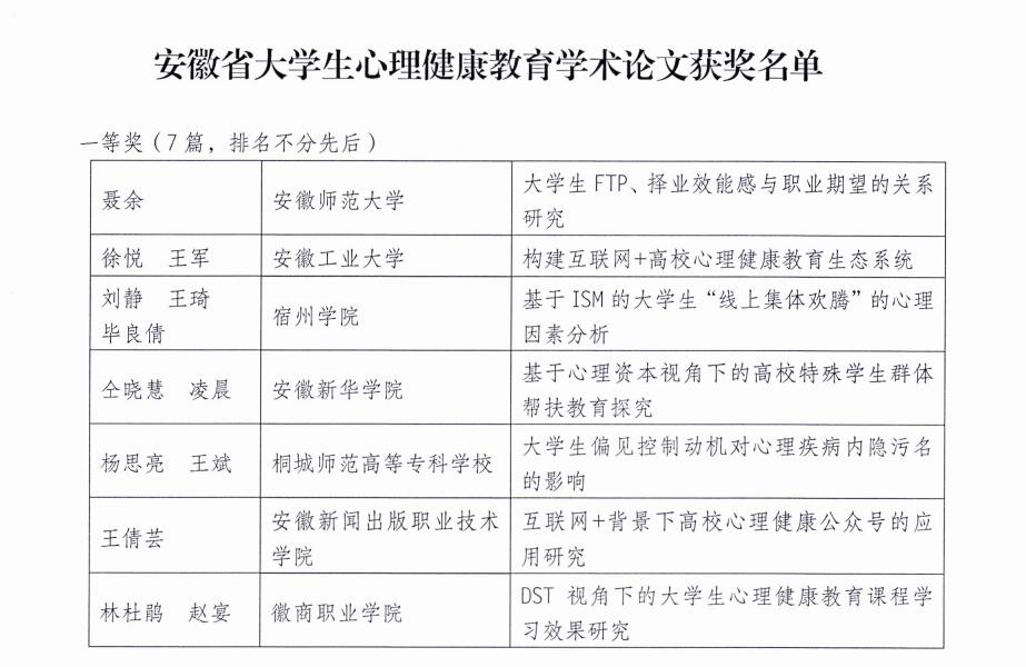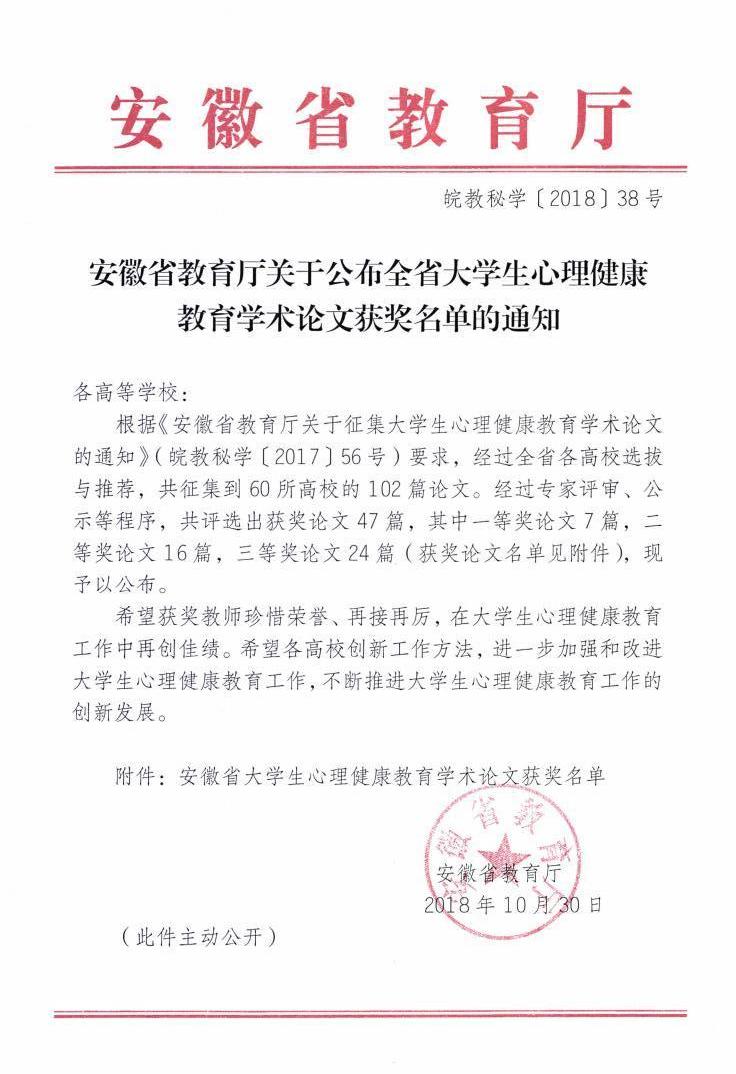 根据《安徽省教育厅关于征集大学生心理健康教育学术论文的通知》(皖教秘学〔2017〕56号)要求,全省共有60所高校,102篇论文参与比赛,经专家组评审,共评出一等奖7篇,二等奖16篇,三等奖24篇。