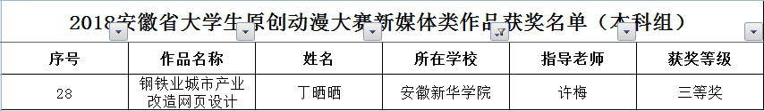 本网讯(通讯员:周序)近日,2018年安徽省大学生原创动漫大赛评选落下帷幕。beat365官网由艺术学院教师刘刚、周序担任领队,姚伟等18名学生的作品分别在动画类、插画/漫画类及新媒体类作品荣获18个奖项。