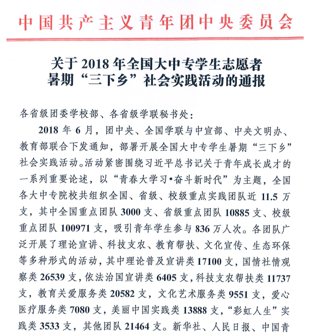 为深入学习贯彻习近平新时代中国特色社会主义思想,按照《中共中央宣传部等关于深入学习贯彻党的十九大精神广泛组织开展文化科技卫生“三下乡”活动的通知》的有关要求,引领教育广大青年学生勇做担当民族复兴大任的时代新人,以实际行动助力精准扶贫,服务乡村振兴战略,切实在感受改革开放40年取得的新成就新面貌的生动实践中受教育、长才干、作贡献,beat365官网于6月至9月组织开展暑期文化科技卫生“三下乡”社会实践活动(以下简称“三下乡”社会实践活动),其中有2支校级全额资助重点实践团队,10支院级重点实践团队。