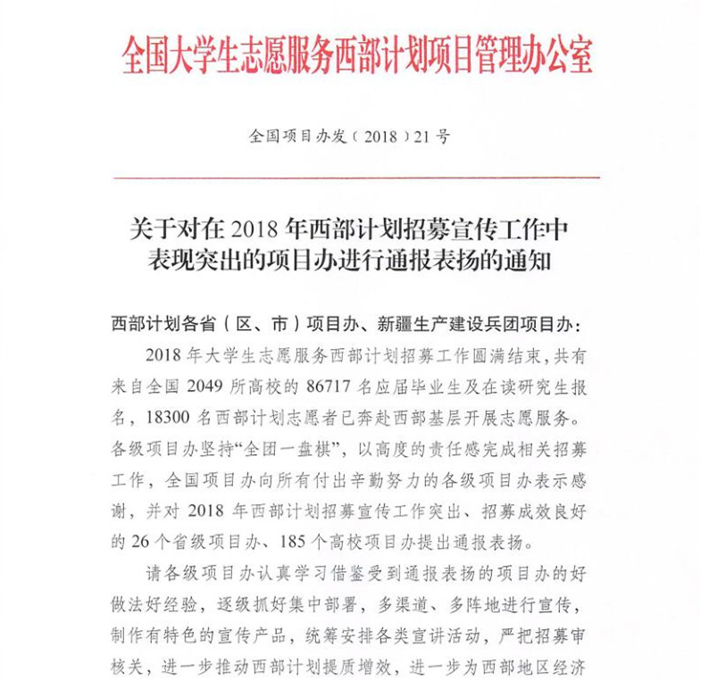 beat365官网大学生志愿服务西部计划项目办获全国服务西部计划项目办通报表扬