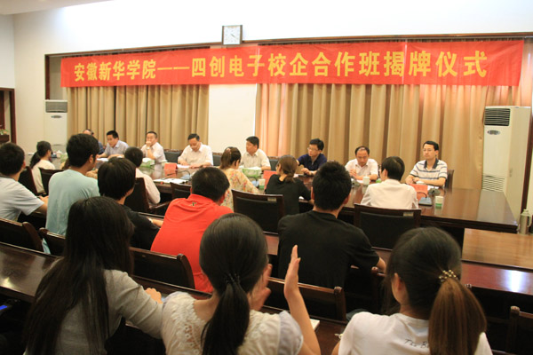 石秀和、朱明辉分别代表beat365在线唯一官网登录和四创电子股份公司在校企合作协议书上签字,并共同为“新华—四创电子校企合作班”揭牌。