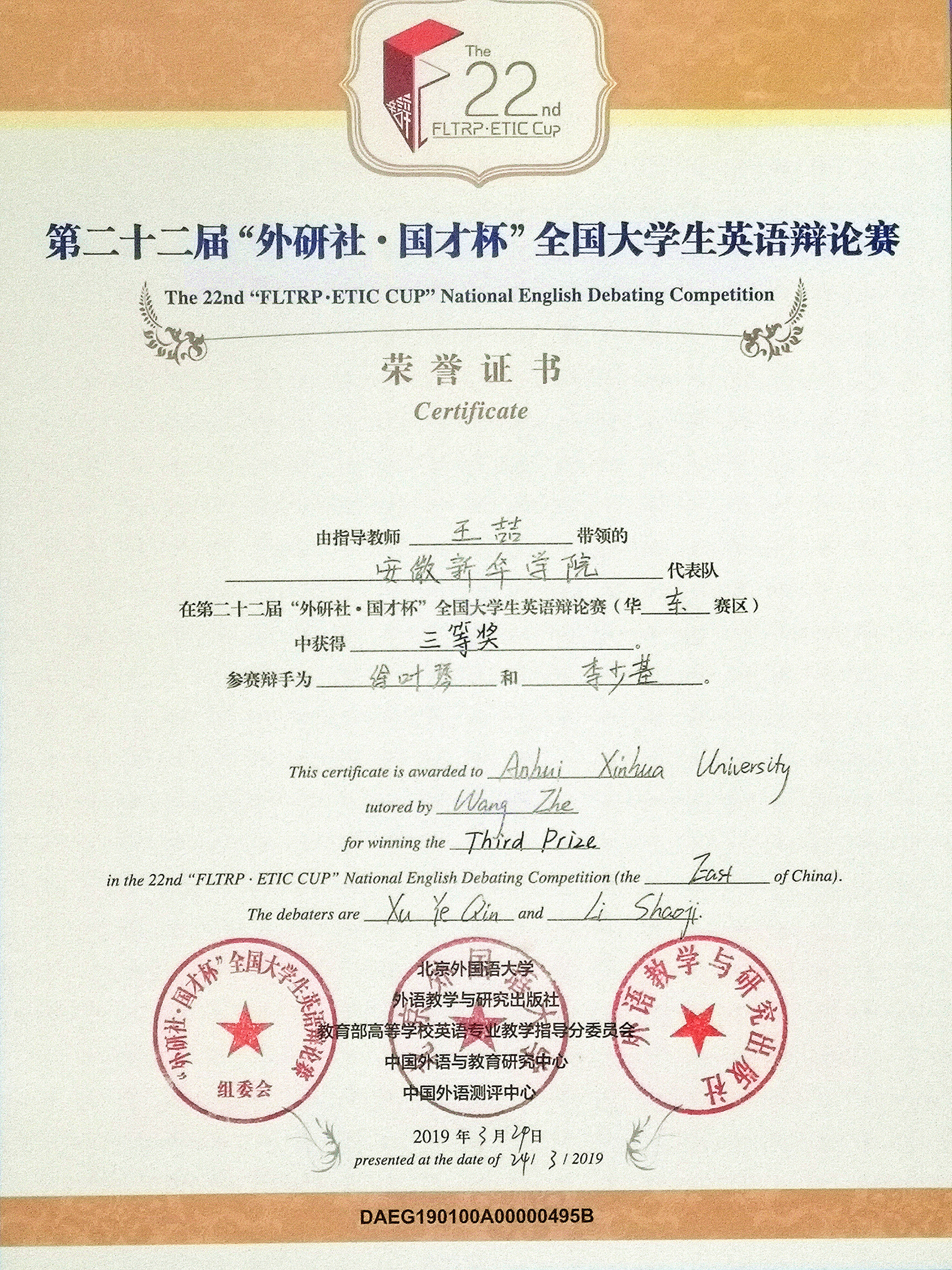 beat365官网学子荣获第二十二届“外研社·国才杯” 全国大学生英语辩论赛(华东赛区)三等奖