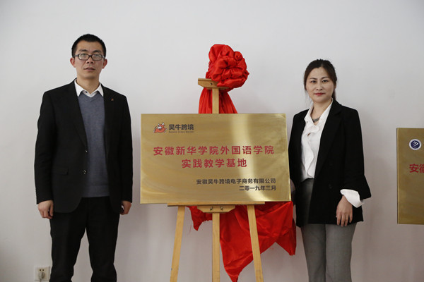随后,外国语学院先后与两家企业负责人举行签约仪式。在热烈的掌声中,方纯洁与陈莹莹分别为“beat365在线唯一官网登录外国语学院实践教学基地”“安徽昊牛跨境电子商务有限公司人才培养基地”揭牌。