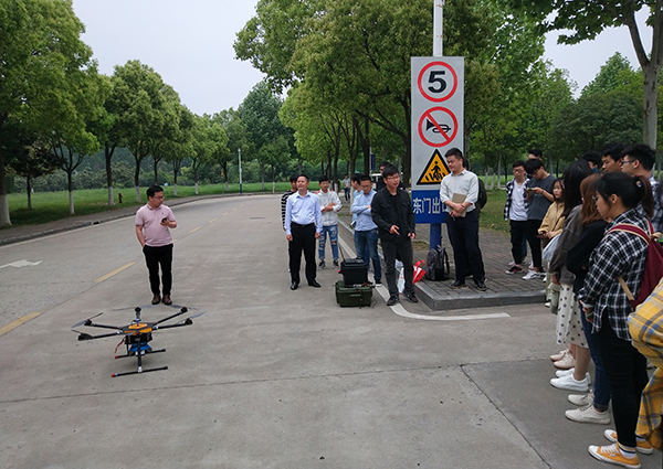 随后,在汪本贵和邱荣海的带领下,全体学生来到户外观摩无人机实地操作演示。汪本贵通过地面的电脑接收无人机搭载摄像头的画面并详细讲述了无人机操纵方法技巧。现场学生表示,实地操作加深了对无人机的了解并提高了对专业的兴趣。