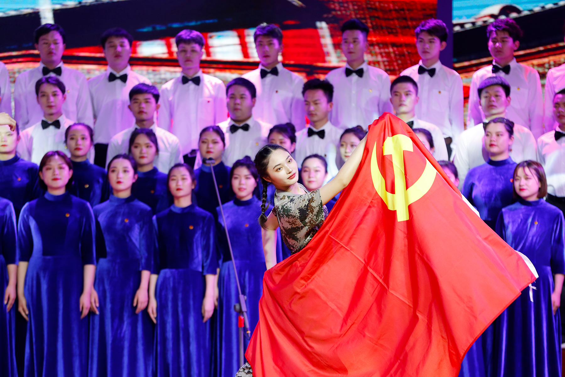 文化与新闻传播学院带来的《映山红》让观众们重温了民族英雄坚毅不屈的精神; 财会与金融学院带来的《向往》,生动反映了党的十八大以来,党和国家事业发生的巨变,讴歌了中国共产党,也传达了人民的心声;电子通信工程学院的《保卫黄河》让现场重温了80年前黄河咆哮发出的民族救亡图存之声;土木与环境工程学院与科技学院带来青春欢快的歌曲让现场弥漫了青春洋溢的气息。