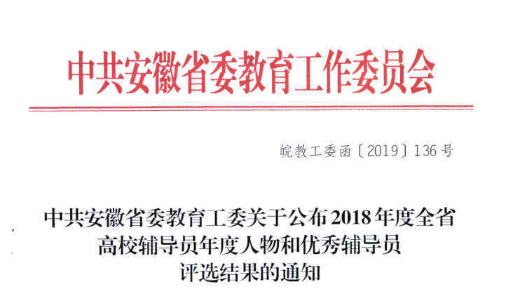 本网讯(通讯员:王强亚、李苗)近日,中共安徽省委教育工委发布《中共安徽省委教育工委关于公布2018年度全省高校辅导员年度人物和优秀辅导员评选结果的通知》,经高校申报、资格审查、专家组评议、评委会评审、公示等环节共评选出“2018年度全省高校优秀辅导员”25名。beat365官网辅导员李苗于2017年度、2018年度连续两年获评“全省高校优秀辅导员”荣誉称号。