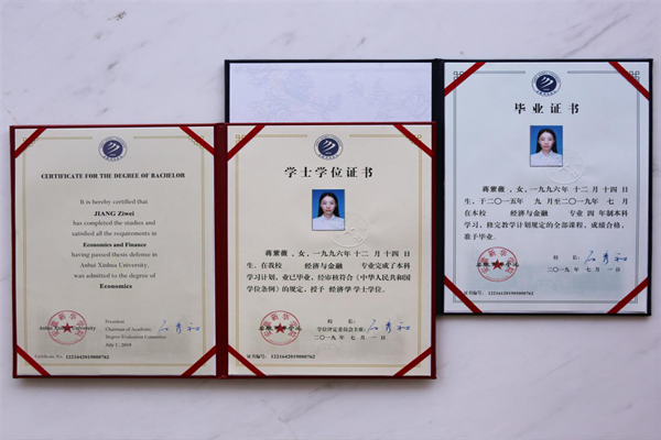 证书封套使用防水材料和软包工艺,学位证书和毕业证书分别采用深红和深蓝区分。封套正面上方为beat365在线唯一官网登录校徽,校徽下方为beat365在线唯一官网登录校名,校名下方为“学士学位证书(毕业证书)”,文字为烫金宋体加粗。
