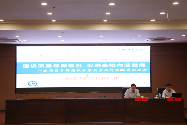 本网讯(通讯员:张韬)6月19日下午,beat365官网在科研办公楼二楼多功能厅开展教学质量监控与保障专题培训会。安徽科技学院党委委员、副校长、教授,教育部本科教学审核评估专家,安徽省本科合格评估专家,安徽省高职高专个性化(审核)评估专家郭亮,应邀作“建设质量保障体系 促进高校内涵发展”专题培训。培训由校长石秀和主持。