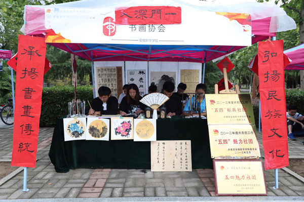 书画协会在迎新期间现场书写汉字、对联等,吸引了众多新生及家长观摩。在迎新期间,书画协会还通过展览书画作品,为新生讲解书画知识让新生感受到华园丰富的社团文化。