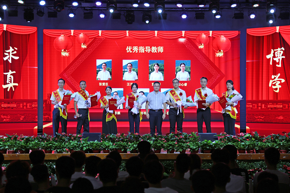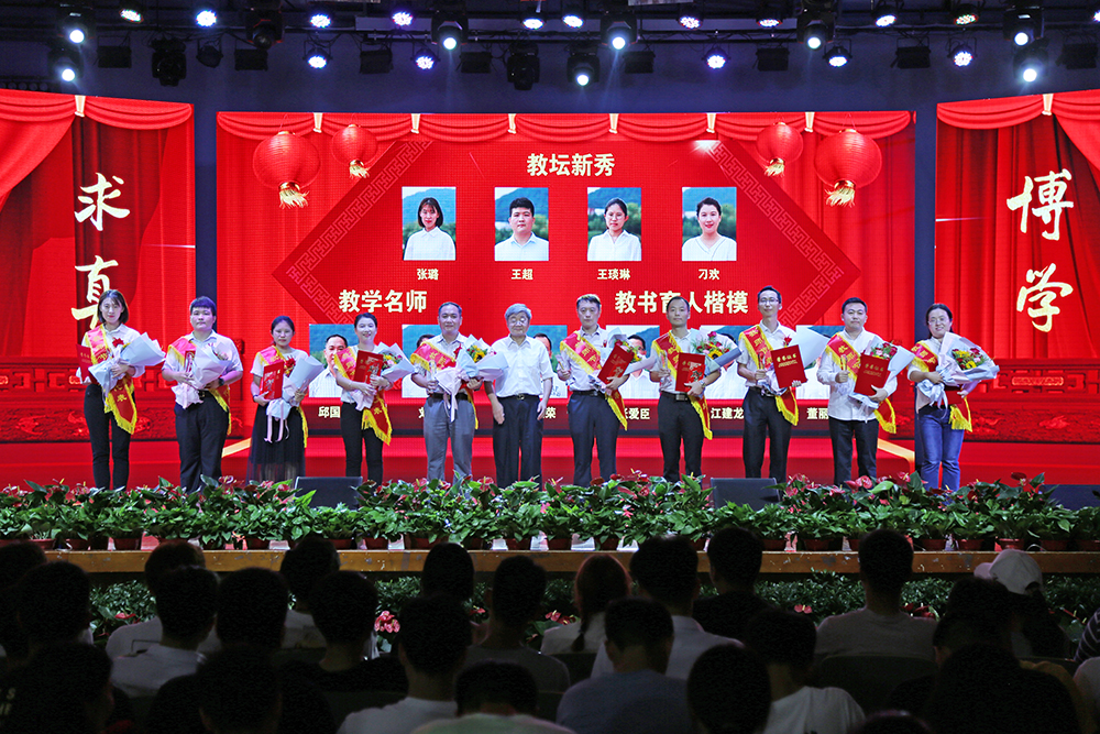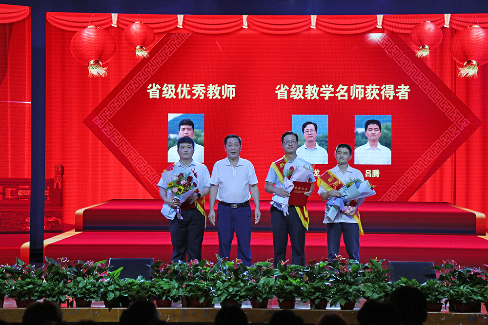 表彰环节分为“一片丹心育桃李”“一枝一叶总关情”“满腔真爱铸师魂”“如椽巨笔绘春秋”四个篇章。第一篇章表彰了“艺体类国赛”“学科与科技竞赛(国家A类)”优秀指导教师。校长助理贺行佳、姜昌植分别为获奖教师颁奖。学生代表手持鲜花,为获奖老师送上节日的祝福。