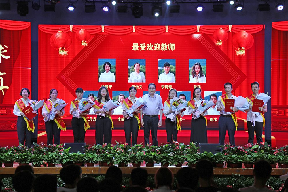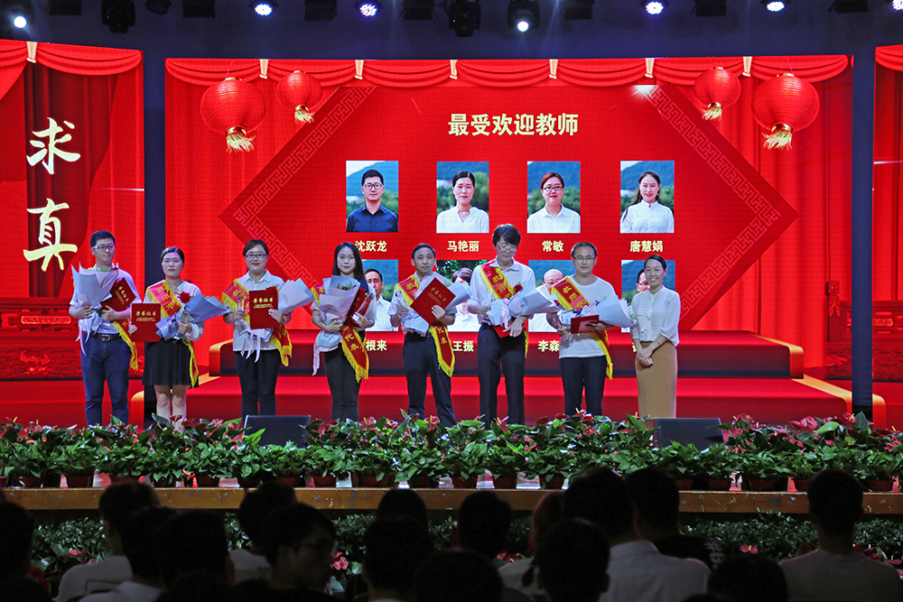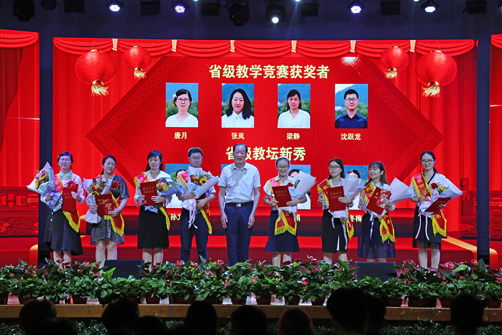 第三篇章“满腔真爱铸师魂”,副校长李金星和常务副校长王丽分别为获得“最受欢迎教师”称号的教师颁奖;学校高级顾问胡昭林为“教坛新秀”“教学名师”“教书育人楷模”获奖者颁奖;校党委书记储国定为“省级教学竞赛”“省级教坛新秀”颁奖;新华集团副总裁黄源为“省级优秀教师”“省级教学名师”获奖者颁奖。