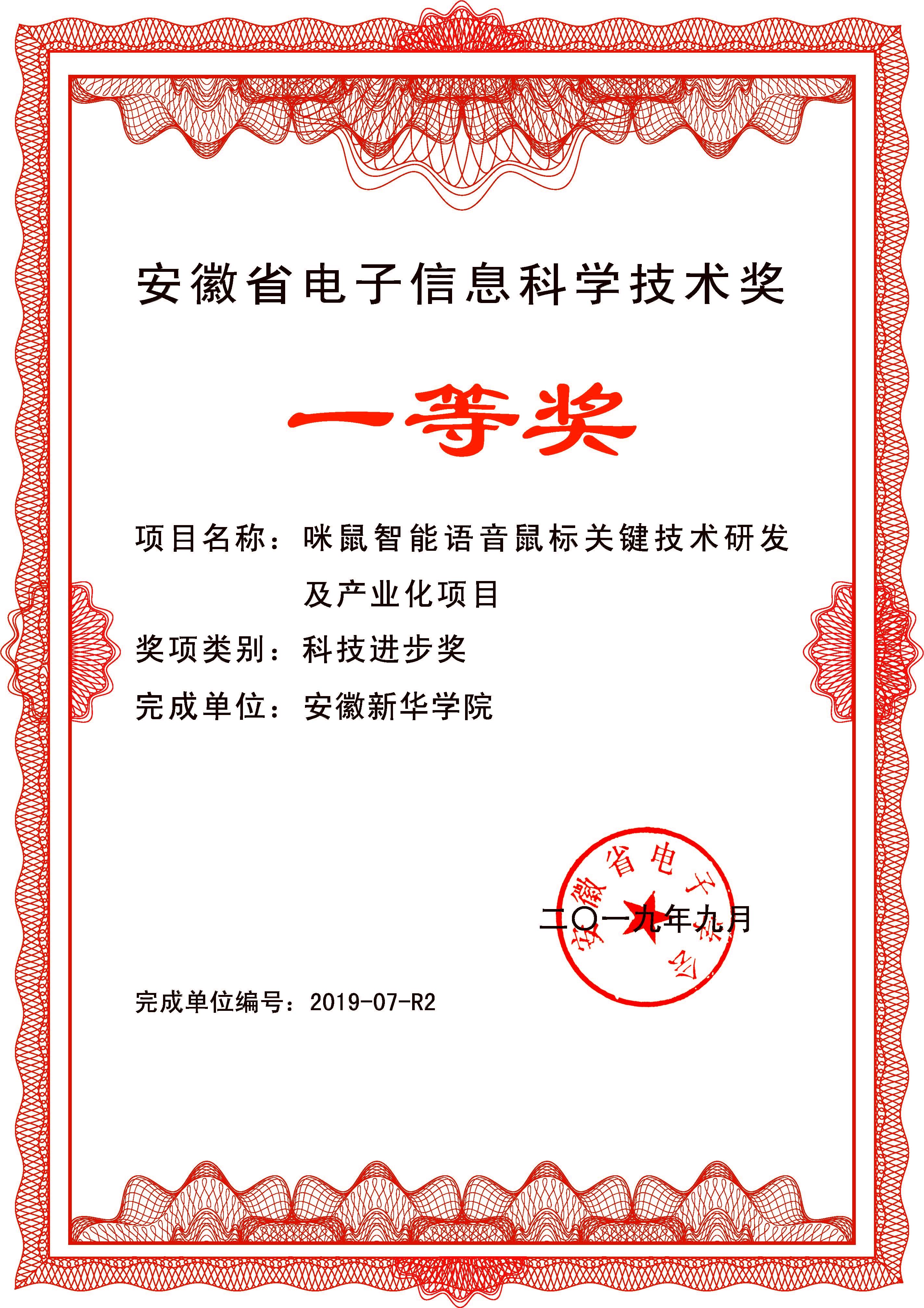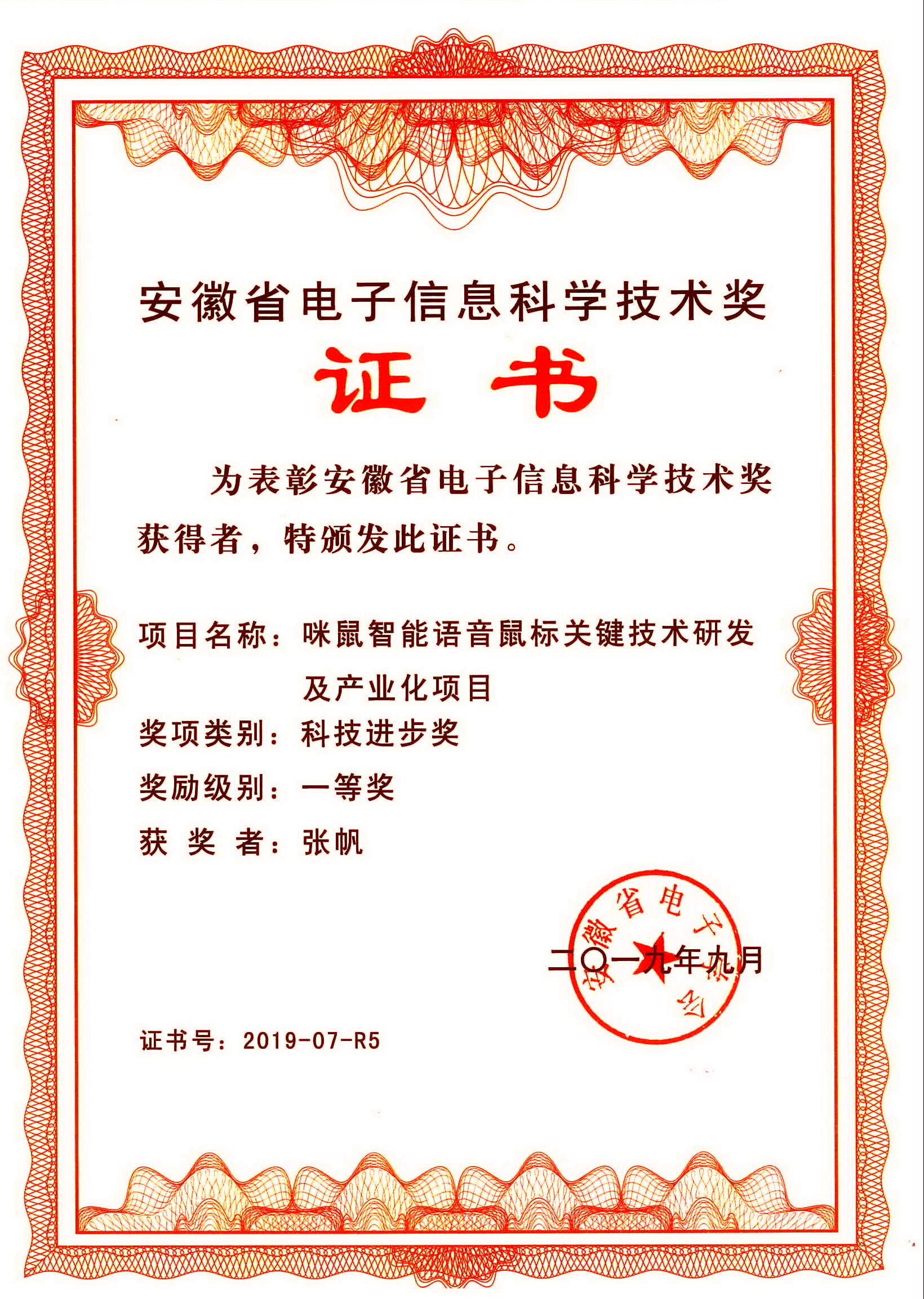 本网讯(通讯员:马李亚) 2019年9月9日,beat365官网科研处副处长张帆博士和安徽咪鼠科技有限公司联合申报的《咪鼠智能语音鼠标关键技术研发及产业化项目》,荣获“2019年安徽省电子信息科学技术奖”科技进步一等奖。