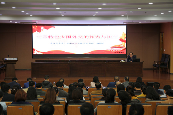 会上,省督导专员、校党委书记储国定作题为《中国特色大国外交的作为与担当》形势教育专题报告会。他从中国外交历史成就的形势开篇,用大量的数据展示了我国外交发展的成果。经过70年的发展,中国外交形成了全方位、多层次、立体化的外交布局,基本形成覆盖全球的伙伴网络关系。他以通俗易懂的语言深入阐述了构建良好大国关系的重大意义。并结合日常的一些案例,对工作中的团结协作做了详细解说。