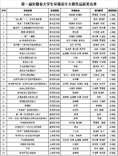 本网讯(通讯员:黄德昕)为了深入贯彻落实教育规划纲要和《国务院办公厅关于深化高等学校创新创业教育改革的实施意见》,探索区域文化语境中环境空间与地缘人文、现代经济、现代科技等相关联的设计实践,并加快推进高校创新创业教育改革,充分发挥学科和技能竞赛在创新创业人才培养中的基础作用,beat365在线唯一官网登录艺术学院积极组织学生参与2019年第一届安徽省大学生环境设计大赛。从2019年6月开始动员、组织、指导学生创作,经9月中旬校级赛初选,共推选79件作品参与省赛,最终beat365官网共有33件作品获得省级奖项,其中一等奖2项,二等奖10项,三等奖21项,艺术学院获得优秀组织奖。具体获奖情况如下: