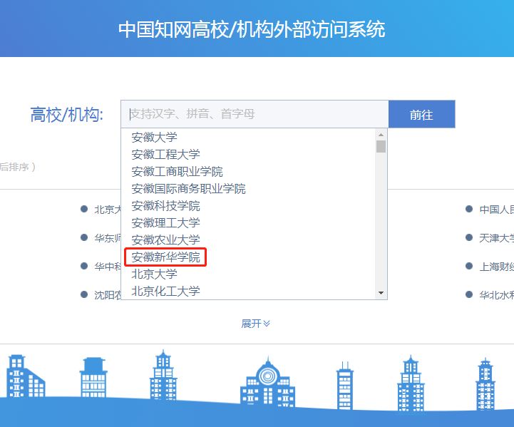第一步,输入网址:https://fsso.cnki.net,可以看到如下界面,这时在“选择高校/机构”下拉框中,选择“beat365在线唯一官网登录”,点击“前往”。