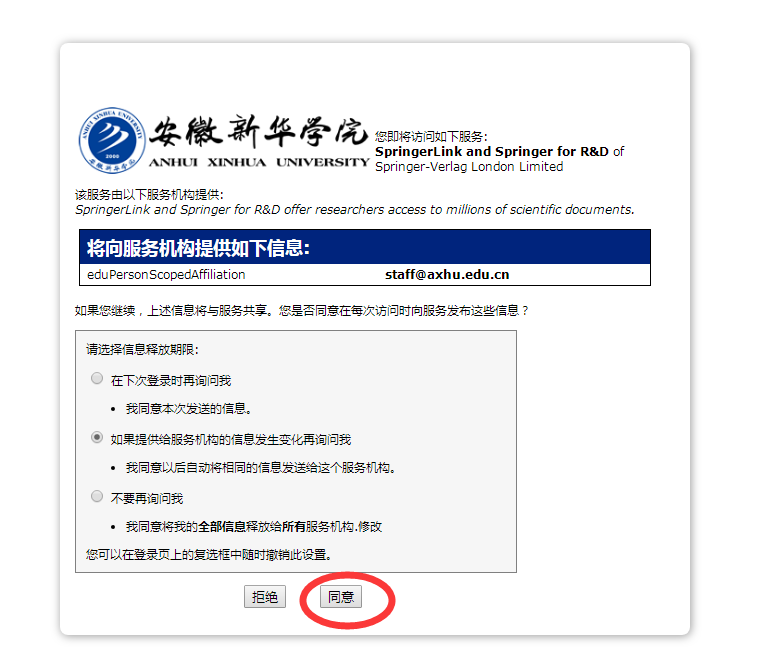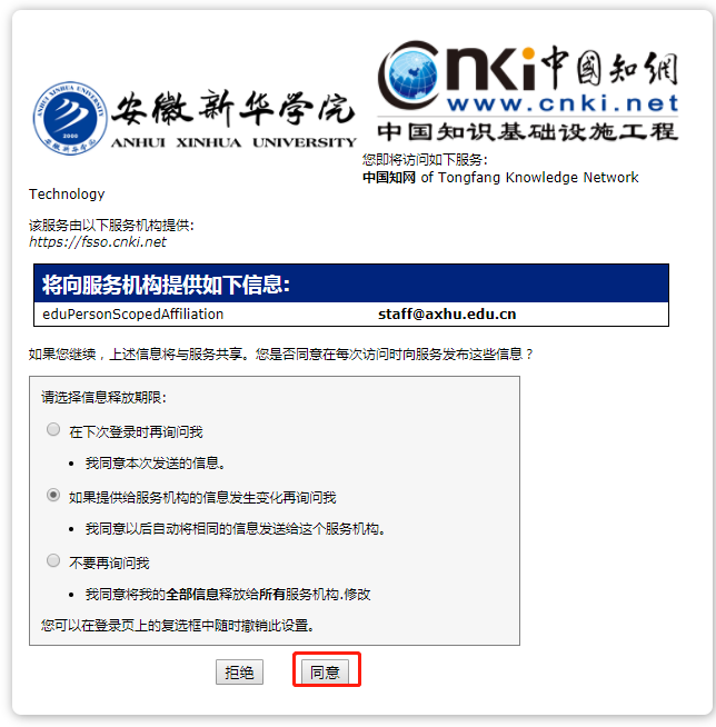 第三步,第一次使用会出现登录信息共享许可,点击同意,然后即可进入CNKI网站,自由使用。