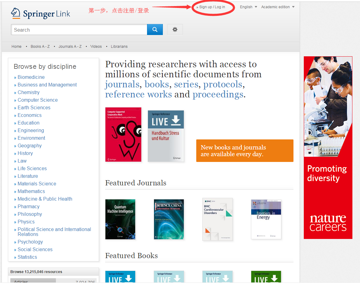 第一步,输入网址https://link.springer.com/,点击Sign up / Log in,如下图: