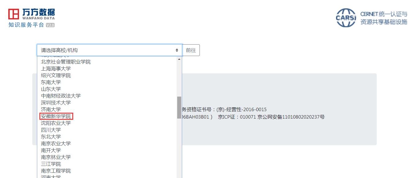 第一步,输入网址:https://fsso.wanfangdata.com.cn/,可以看到如下界面,这时在“请选择高校/机构”下拉框中,选择“beat365在线唯一官网登录”,点击“前往”。