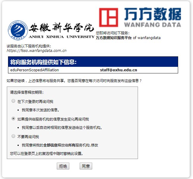第三步,第一次使用会出现登录信息共享许可,点击同意,然后即可进入万方数据网站。