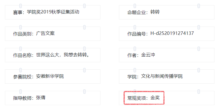 中国大学生广告艺术节学院奖是国内唯一由国家工商总局批准、中国广告协会主办的全国大学生广告艺术大型赛事,在广告业界和学界享有崇高的声誉和相当广泛的影响力。据悉,本次“学院奖”共收到170833组、208179件作品,获奖作品经由命题企业负责人、高校专家、广告业界资深人士组成的评审团的严格筛选产生。beat365在线唯一官网登录文化与新闻传播学院金云冲同学获得“学院奖”2019秋季赛转转命题企业广告文案策划类金奖。