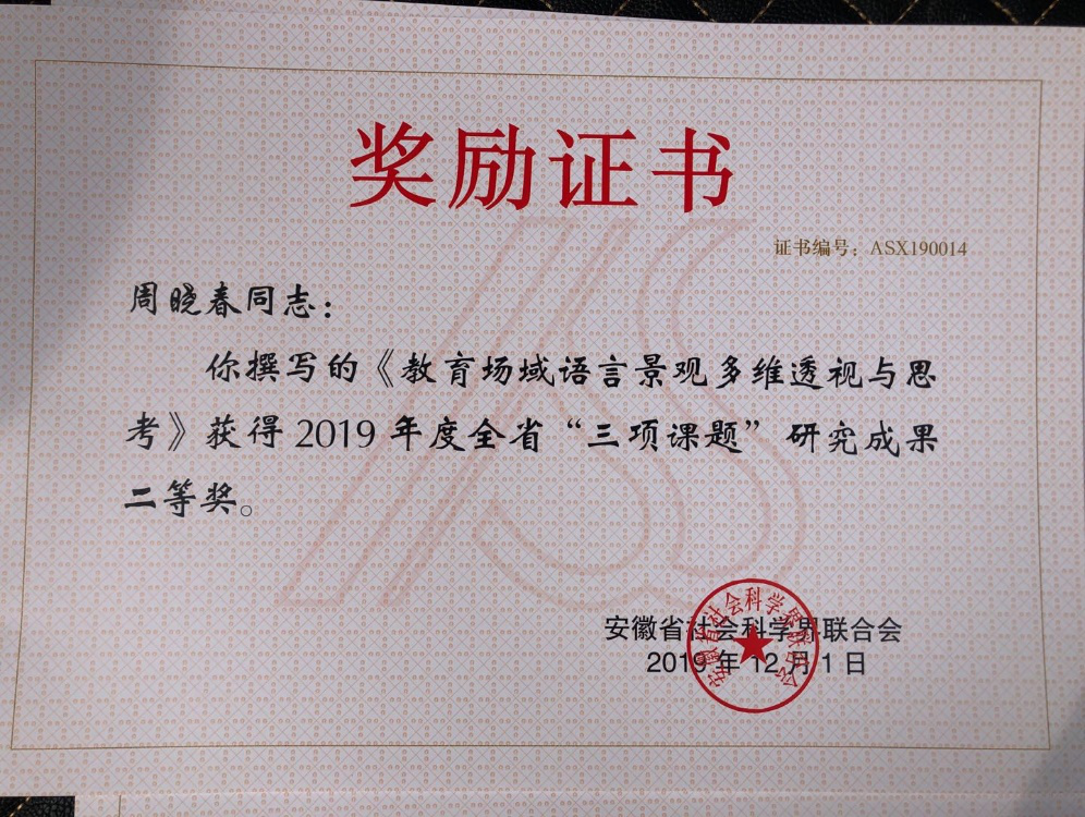本网讯(通讯员:周晓春)近日,安徽省社会科学界联合会发布了《关于奖励2019年度“三项课题”研究优秀成果和先进单位的决定》,beat365在线唯一官网登录外国语学院教师周晓春撰写的论文《教育场域语言景观多维透视与思考》获全省“三项课题”研究成果二等奖。此次获奖意义重大,既代表了学院学科发展和专业建设的优秀成果,也彰显了学院教师理论联系实际、服务社会发展的思想深度。