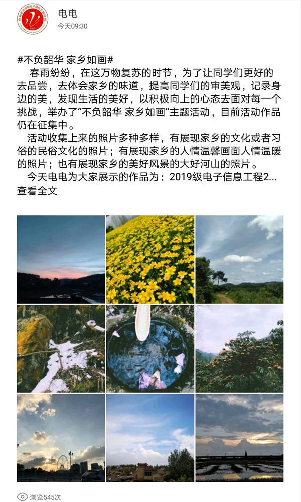 抗“疫”期间,电子通信工程学院开展了“不负韶华•家乡如画”活动,引导广大学子爱故乡,爱家国,厚植家国情怀。抗疫志愿者、电子通信工程学院2016级电气2班班长刘建国说:“疫情暴发后,原本热闹的家乡突然静止了,在抗击疫情的同时,利用这种方式展示家乡的美,能够让我们更加热爱祖国热爱家乡,坚定决心保卫家乡”。在“不负韶华•家乡如画”活动的参赛作品中有城市鸟瞰图,有描摹家乡小路、抗疫现场的画面……每一幅作品在美育的同时都表达了对祖国深深的热爱。