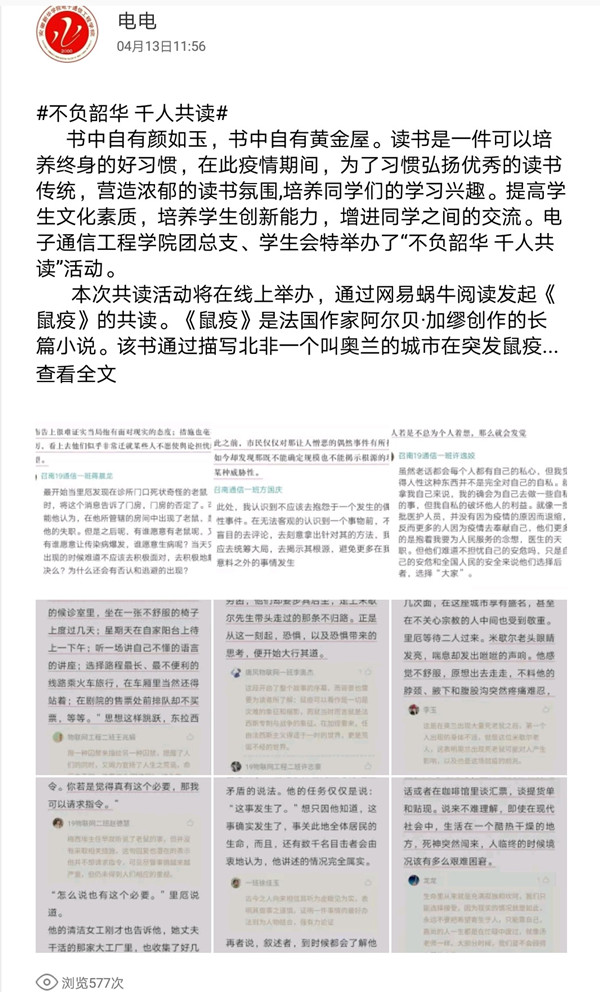 保证学习效率,打造优良学风。“千人共读”爱阅读活动来“助攻”,该活动结合当下热点问题,围绕学生素质教育,设定不同主题,邀请学生推荐书籍,学生报名参与线上读书分享,学院汇集每期读书分享和读书笔记。2018级通信工程2班王建阳说:“笔记我会整理两次,第一次是跟随老师思路,第二次就是对课后进行复习时重新排版,在温故而知新的同时保证了我的学习效率。”
