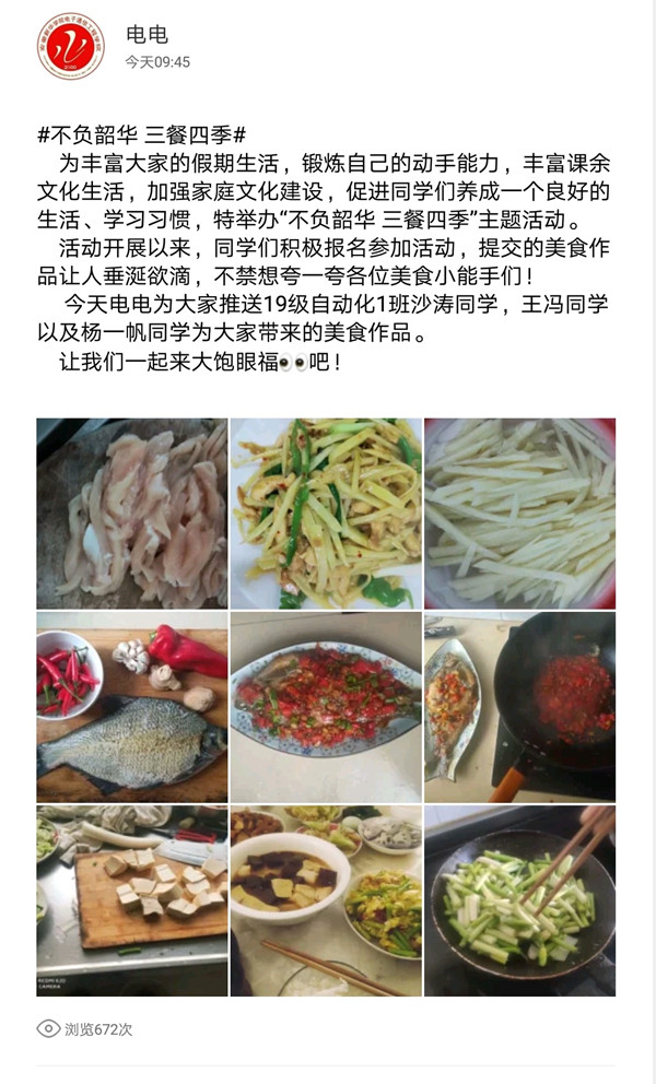 晒美食、秀厨艺成了疫情期间居家生活的一部分,活动上线以来,学生们参与热情高涨,“三餐四季”厨艺大比拼成了同学们课余生活的一道风景线。能亲手为家人做一顿饭,是很多学生表达感恩的方式。19自动化1班的沙涛同学说,每天给父母做顿饭,从中感受彼此的爱,是一种幸福,这种幸福很踏实。该项活动不仅促进学生们养成良好的生活习惯,同时加强了劳动教育和感恩教育。