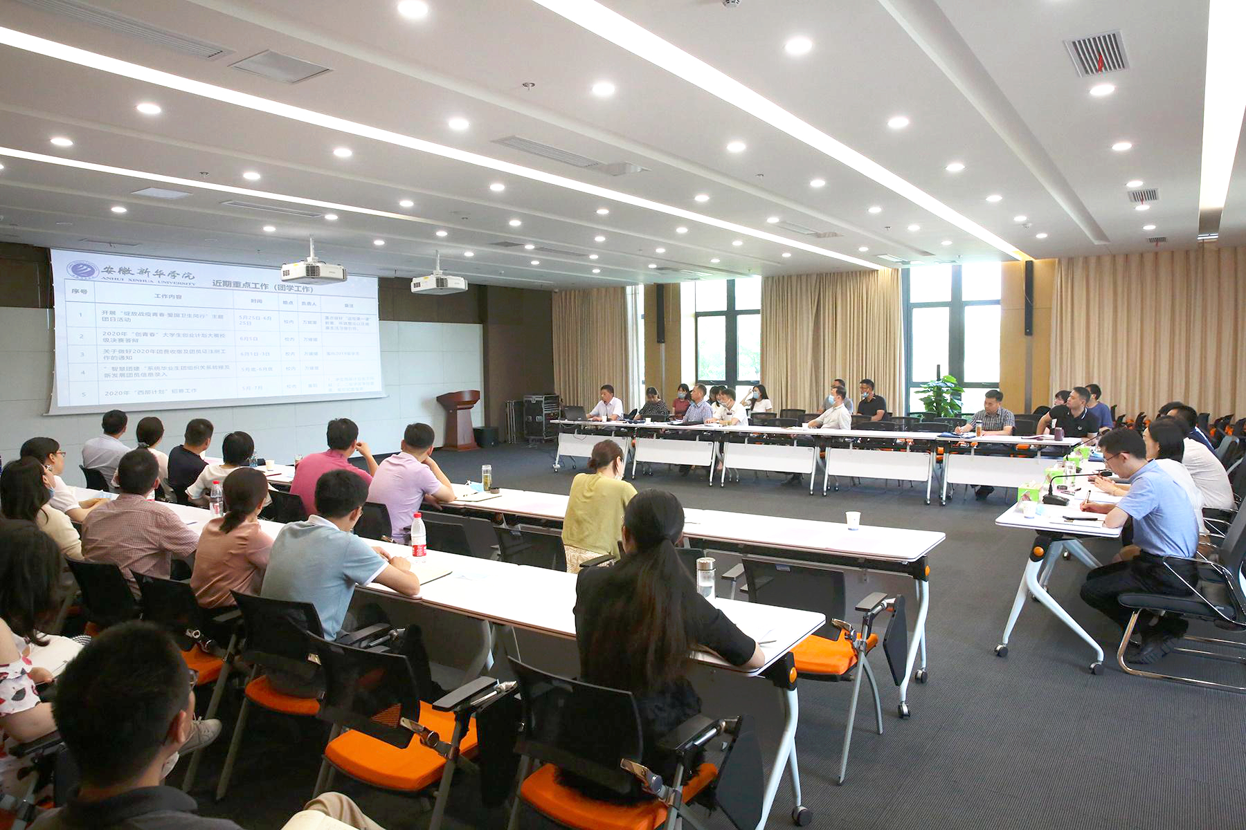 首先,学生处对2019-2020学年第二学期的学生返校工作做了全面的复盘和总结,整体工作平稳有序、暖心有爱,各二级学院特色鲜明、亮点突出。对学生安全管理工作、就业创业、心理健康等工作数据进行了横向和纵向的对比,全面细致的总结了学生返校后工作的成绩和存在的问题,并就下一阶段的重点工作做了细致的部署和安排。保卫处就疫情防控工作常态化、防电诈、防溺水、防火防盗宣教等工作进行了布置与要求。教务处从线上教学总体情况、线上转线下教学工作安排以及存在的问题及采取的措施做了汇报。